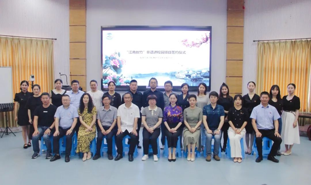 仪式开始,我校胡素方校长同杭州市桐庐县分水实验小学徐炎校长分别进行致辞,拉开了本次授牌仪式的序幕。随后,我校扬琴专业教师,国家一级演奏员,江南丝竹演奏家陈霞芬老师与桐庐县分水实验小学江南丝竹社团教师进行了揭牌仪式并合影留念。最后,我校胡素方校长同杭州市桐庐县分水实验小学徐炎校长在桐庐县教育局党委委员副局长徐永茂、分水镇副镇长俞秋萍的见证下,共同签订“非遗进校园”共建协议书。
